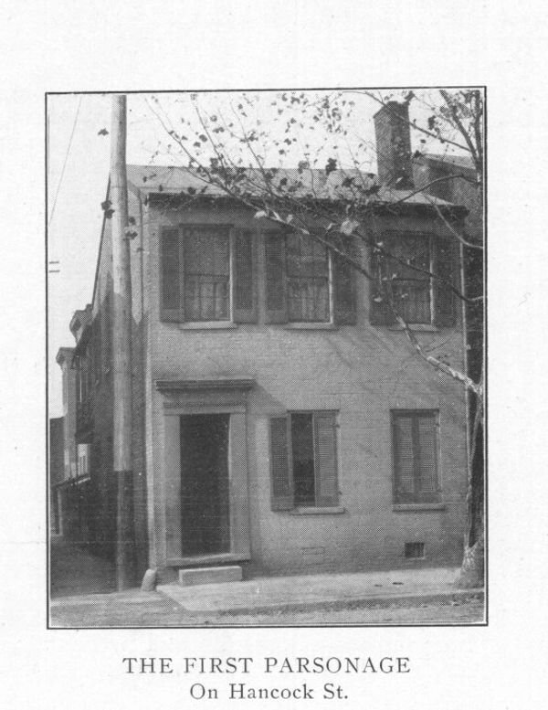 "As early as 1836, a small band of German people held irregular religious meetings in a building which stood on the present site of the Fourth Presbyterian Church, on Hancock street, near Market. One Brandauer, who was not an ordained minister, but an educated layman, conducted these services, and after his removal from the city, a certain Dr. Fischer succeeded him in this evangelical work. An organization was not effected until toward the close of the year 1843, when the following men met for that purpose at the residence of Mr. Frederick Groszmann, 308 East Main Street: John Westermann, John Mallis, Frederick Groszmann, John Rubsch, Henry Rubsch, Valentine Weidenbach, Henry Graf, John Hermann and G. Henry Stockhoff. They chose Frederick Groszman for president, and John Westermann, for treasurer. Mr. Groszman also acted in the capacity of secretary. These men with two exemptions, were less than thirty years old.